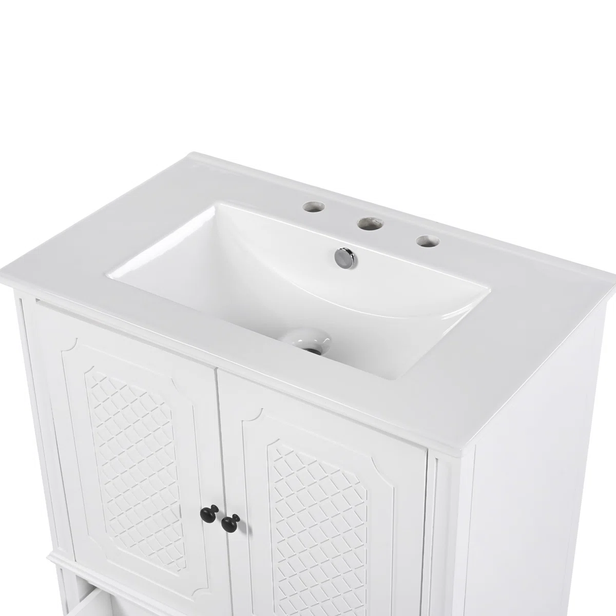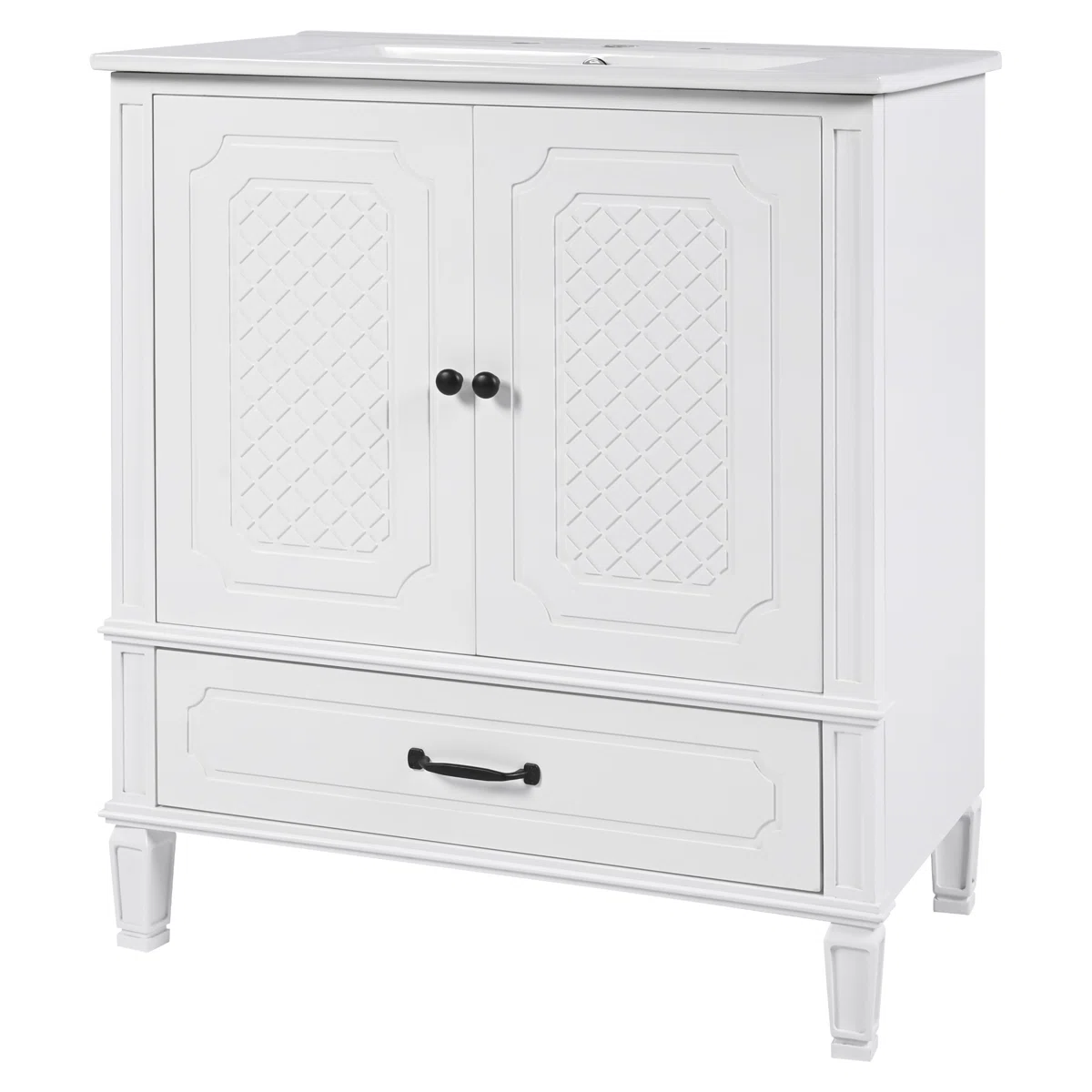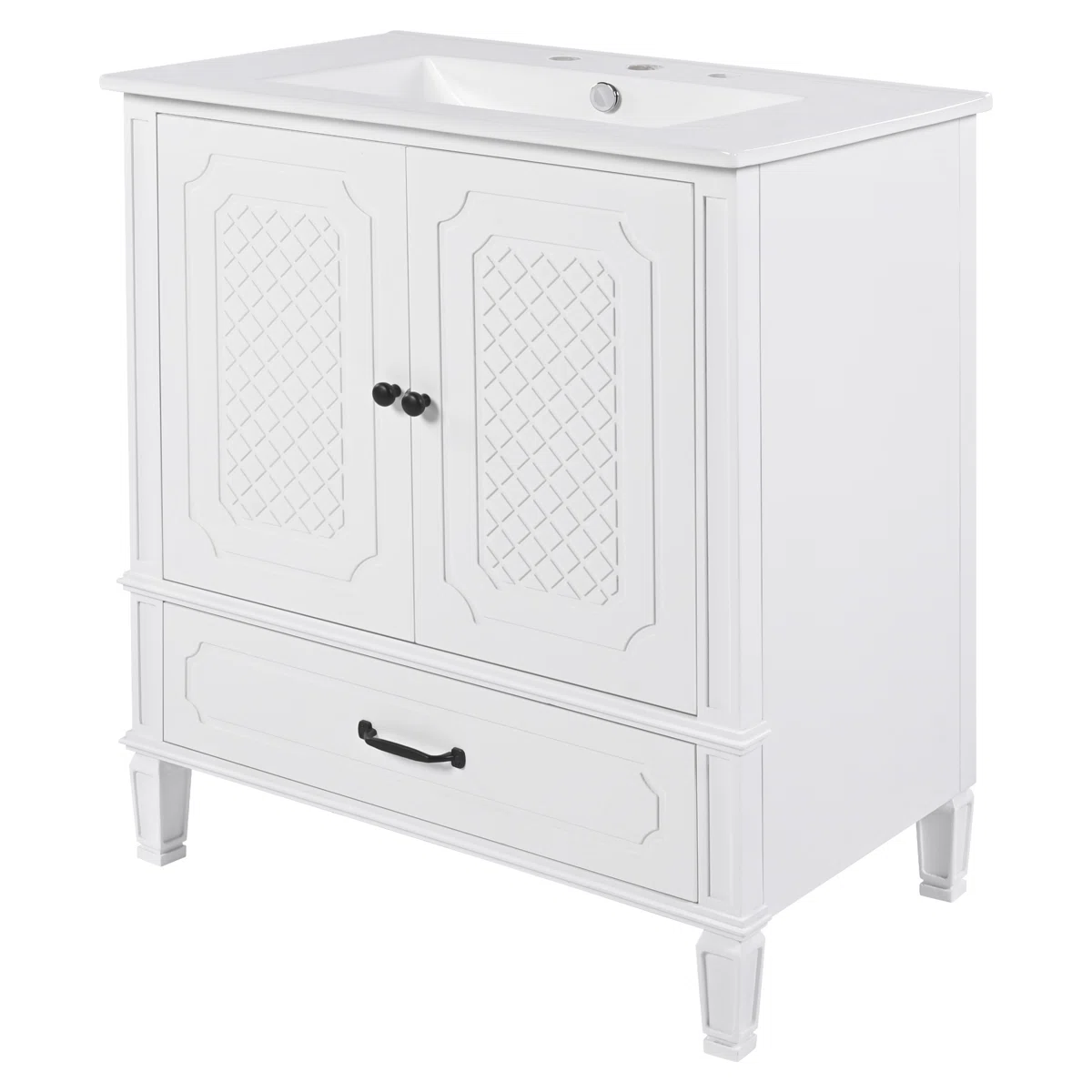 This 30" Vintage Style Bathroom Vanity by Winston Porter combines timeless design with practical functionality. Constructed from solid wood and MDF with a painted finish, the vanity offers durability and easy maintenance for everyday use. The smooth ceramic undermount sink features pre-drilled holes for an 8" faucet (not included) and an overflow with metal trim for safety.