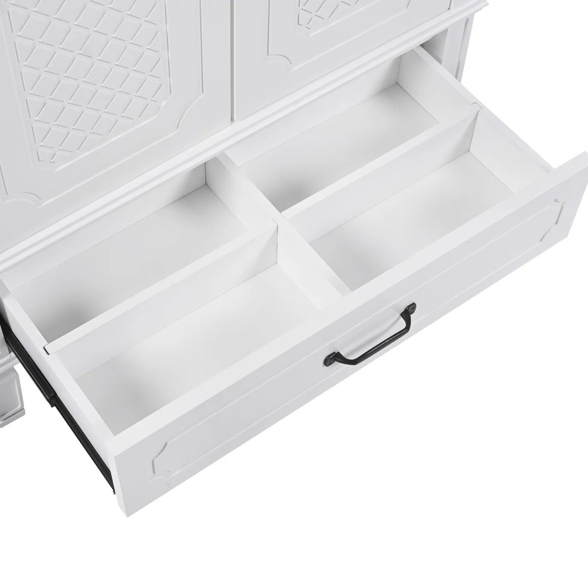 • One cabinet with door shelf, adjustable shelf, and one large drawer with removable panel