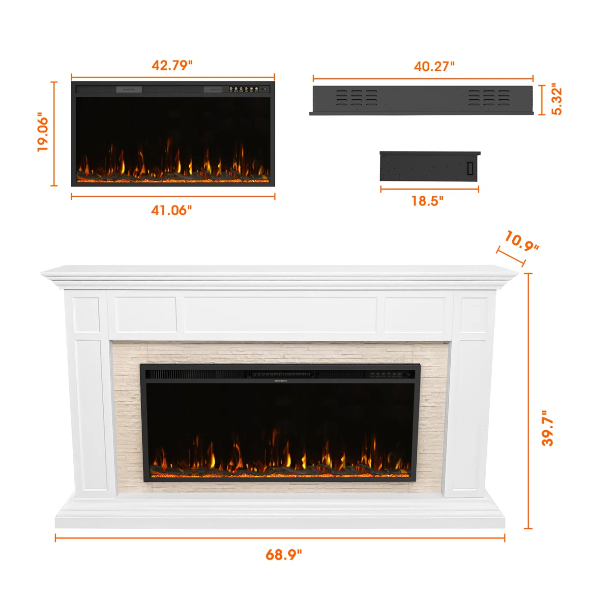 • Mantel dimensions: 39.7" H x 68.9" W x 10.9" D