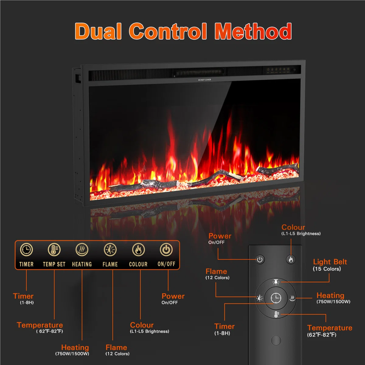• Flame can operate without heat; adjustable brightness and flame size
