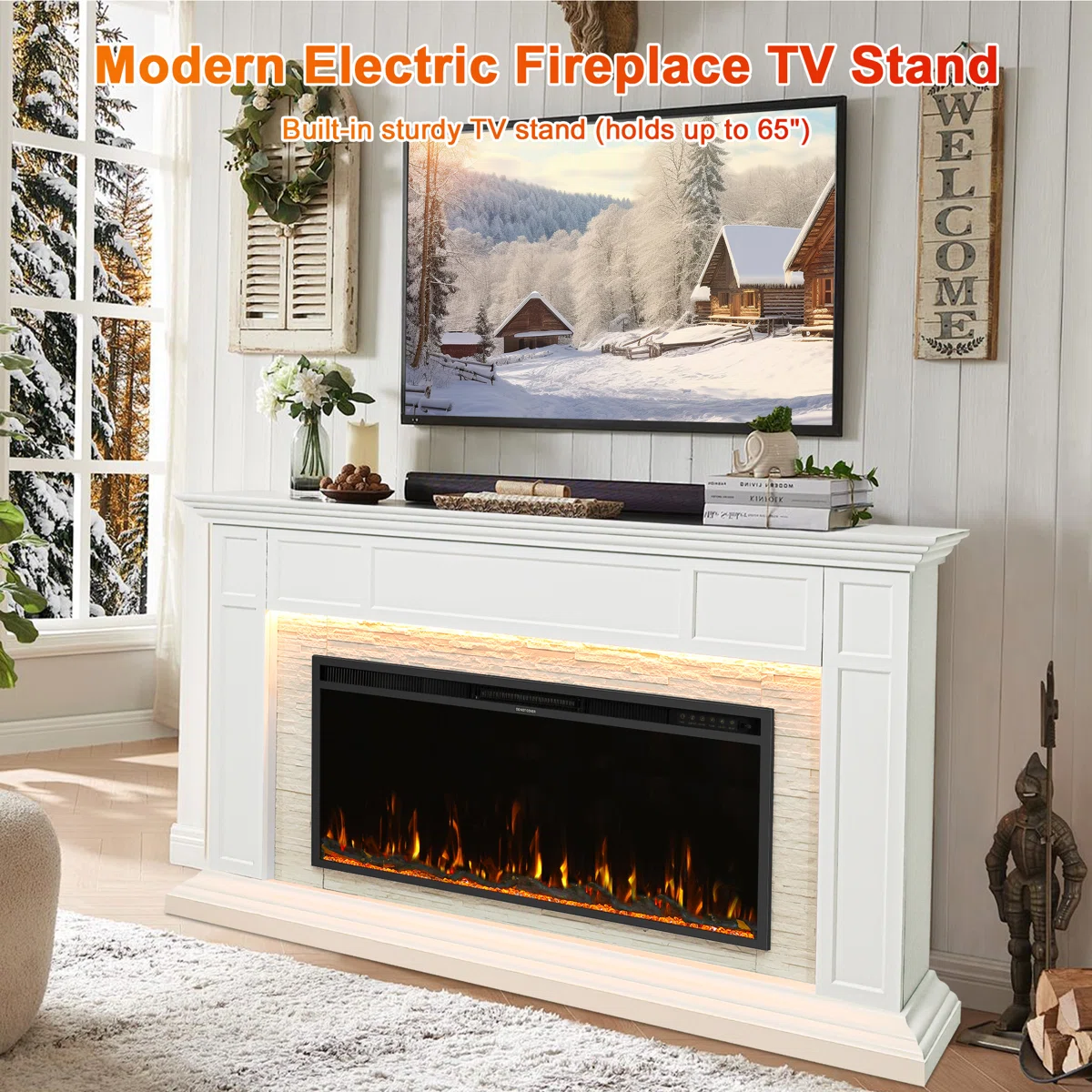 • Freestanding 69" electric fireplace with mantel